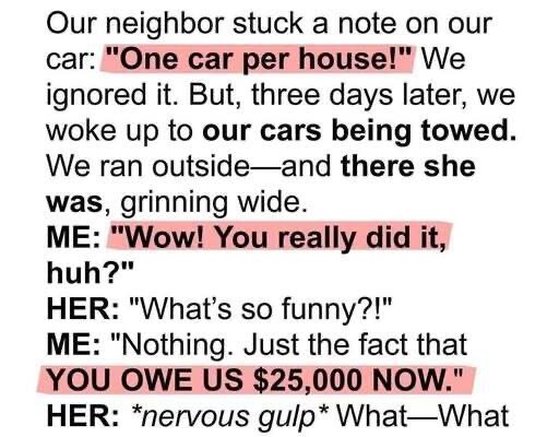 Lindsey chatted about how peaceful the neighborhood was, then abruptly shifted the conversation to rules. She pointed out that the homeowners’ association allowed only one car per driveway, despite both of ours fitting easily. Jack questioned it calmly, but she dismissed him with a tight smile, insisting rules mattered more than convenience. After she left, we laughed it off, assuming she was just overly invested in community order.