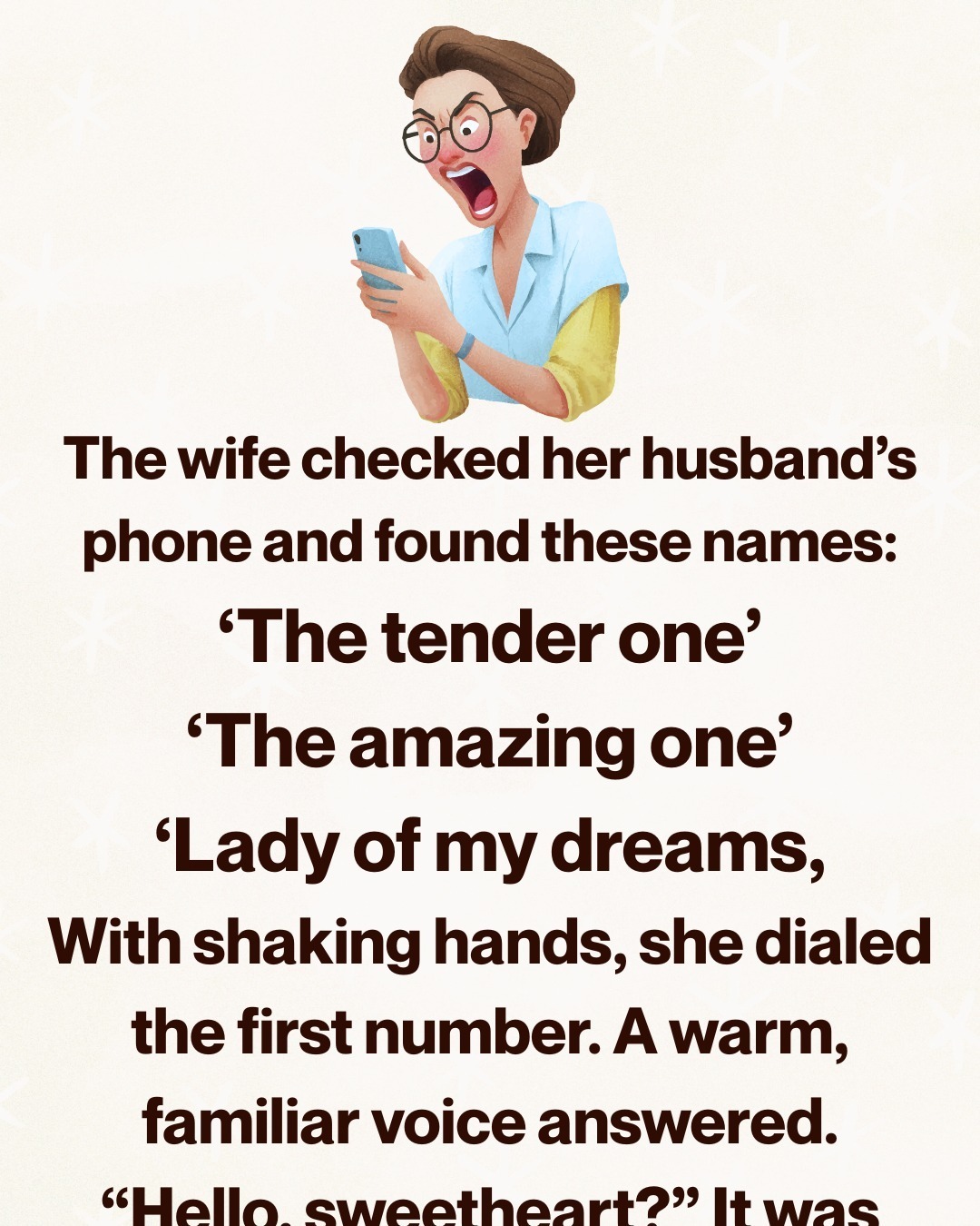 She ended the call without a word and collapsed onto the floor, sobbing until her chest hurt. When he woke and found her like that, she confessed everything—the doubt, the fear, the shame.